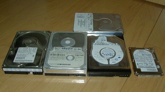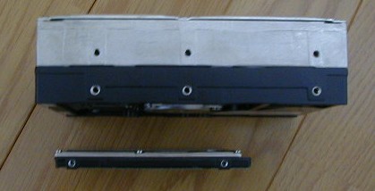 一番右は 9.5mm厚の2.5インチノート用ですがその隣、段差があるでしょ? これが例のドライブです。 横から見たところ 下は2.5インチですが、真中の黒いのがそうです。 確実に薄いでしょ。 多数取り付けの際に隙間が空くので熱も逃げやすいです。 おまけに5400回転ですから発熱自体も少ないし・・・。
